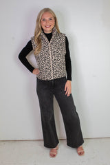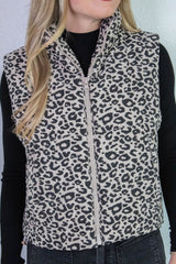 Add a wild touch to your outfit with the Caroline Leopard Print Puffer Vest in khaki. This playful puffer style features a cozy mock neck and a zip-up closure to keep you snug. Zippered side pockets add practical flair for stashing your essentials while on the go. Perfect for layering with attitude and warmth!