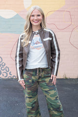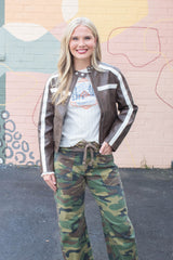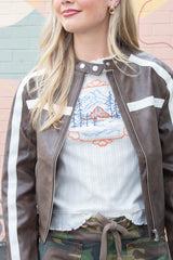 Step out in style with the Emery Contrast Stripe Jacket in rich brown faux leather. Featuring eye-catching ivory stripes, zipper pockets for your essentials, and a zip-up front with a button neck closure, this jacket blends edgy vibes with practical flair. Perfect for adding a playful twist to any outfit while keeping you comfy and confident!