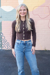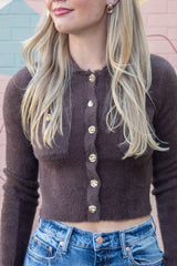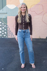Meet your new favorite layer: the Eva Collared Cropped Cardigan in warm brown. With its chic collar, playful gold buttons, and handy chest pockets, it adds a dash of fun to any outfit. The long sleeves and ribbed hem with cuffs keep you cozy, while the cropped cut shows off your style without hiding your favorite high-waisted pieces. Perfect for mixing and matching with your wardrobe’s best!