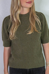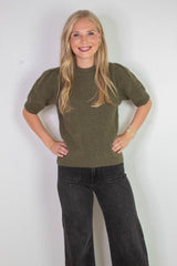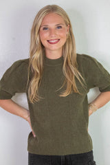 Brighten your wardrobe with the Melanie High Round Neck Sweater in Olive. Featuring charming short puff sleeves and delicate pointelle knit details, this playful piece adds a touch of whimsy to your everyday look. The ribbed hem and cuffs provide a cozy fit that hugs just right, keeping you comfortable and stylish all day long. Perfect for layering or wearing solo, this solid olive sweater brings effortless fun to your casual outfits!