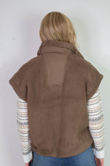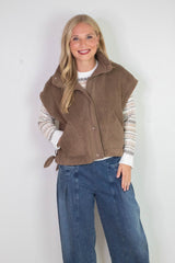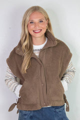 Stay cozy and stylish with the Addison Button Front Faux Fur Vest in brown. Featuring a snug mock neck and playful side ties, this vest adds a fun twist to your layering game. Plus, side pockets offer a handy spot to tuck your hands or small essentials. Embrace warmth without sacrificing flair in this irresistibly soft, button-front favorite!