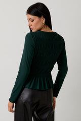 Add a touch of charm to your wardrobe with this Elsie top in dark green. Featuring a round neck, smocked bodice, and long sleeves, it blends comfort with a feminine flair. The playful ruffled hem adds movement and a fun finish, making it perfect for both casual outings and dressier occasions!