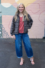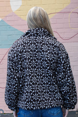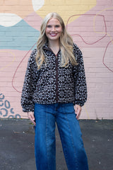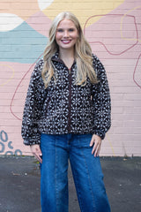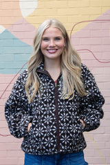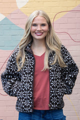 Cozy meets festive in the Hadley Snowflake Sherpa Jacket. This dark brown sherpa jacket features a playful snowflake print that adds charm to chilly days. With a snug mock neck and easy zip-up closure, it keeps the cold out while side pockets are perfect for warming your hands or stashing small treasures. Stay warm and stylish with a jacket that’s as fun as it is functional!