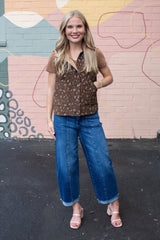 Stay cozy and stylish with the Lia Floral Quilted Puffer Vest in Brown Multi. Featuring a playful floral print on soft corduroy, this puffer-style vest has a mock neck and easy zipper plus snap button closure to keep the chill out. Side pockets are perfect for storing your essentials or warming your hands. Add a touch of charm and warmth to any outfit with this fun, versatile vest!