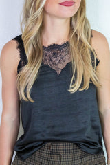 Elevate your style with the Georgina Lace Trim Satin Cami in black. This silky satin cami features delicate lace trim and adjustable spaghetti straps for a custom fit. Playfully flirty side slits add movement and a touch of allure, perfect for day-to-night looks that make you feel effortlessly chic!