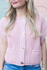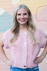 Stay cozy and cute with the Dorothea Chunky Button Down Sweater in blush. This playful, cropped knit features short sleeves, a round neck, and handy front pockets—perfect for keeping your essentials close while adding charm to any look. A fun twist on a classic button-down, it’s your go-to piece for easy style with a comfy, chunky texture!