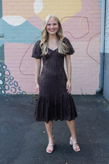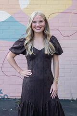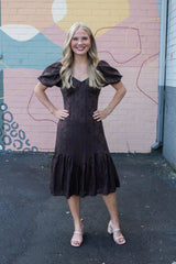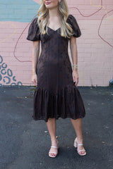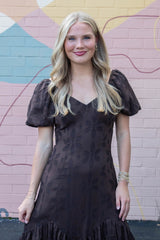 The Ana Mesh Flower Midi Dress in warm brown features a charming sweetheart neckline and flirty short puff sleeves for a playful vibe. Its midi length and ruffled hem add a fun, twirly touch, while the back zipper closure ensures a perfect fit. Ideal for sunny days and special occasions alike, this dress blends romantic details with effortless style!