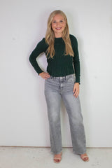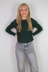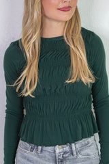 Add a touch of charm to your wardrobe with this Elsie top in dark green. Featuring a round neck, smocked bodice, and long sleeves, it blends comfort with a feminine flair. The playful ruffled hem adds movement and a fun finish, making it perfect for both casual outings and dressier occasions!