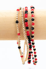 Add a pop of sparkle and color with these Aleena Glass & Gold Beaded Bracelets. Featuring vibrant red and black beads paired with shiny gold accents, this stretchy set of four slides on easily for a comfortable fit. Mix and match to brighten your look or stack them all for a bold, playful statement. Perfect for adding a little fun flair to any outfit!