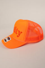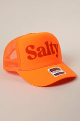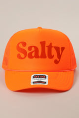 Rock your style with our Salty Printed Foam Trucker Hat. Whether you're hitting the beach or just want a fun accessory, this neon orange hat with burnt red lettering has you covered. Featuring a mesh back and adjustable snap closure, it's comfortable and practical. Plus, our quirky printed lettering adds a touch of personality!