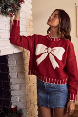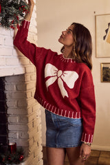 Sweetly styled and undeniably fun, the Brandi Bow Sweater is your ticket to effortless elegance. This crew neck features an adorable bow graphic that steals the show, while long sleeves and contrast stitch detailing keep things interesting. Soft, comfortable, and ready to pair with everything in your closet—this is the sweater that makes getting dressed feel like playtime.
