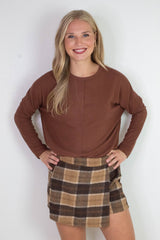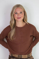 Bring cozy charm to your wardrobe with the Eliana Seam Front Top in warm Chestnut. Featuring a playful round neck and stylish seam front detail, this top adds subtle flair to everyday looks. The long sleeves keep you comfy and ready for anything from coffee dates to weekend outings!