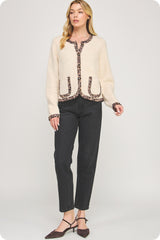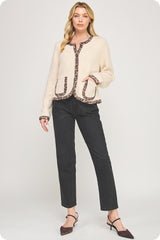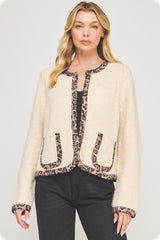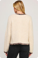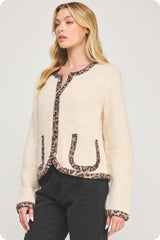 Leeda Leopard Trim Knit Jacket, Light Taupe/Black