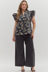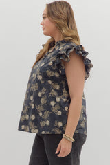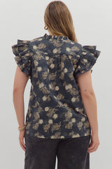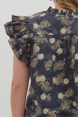 Add a touch of whimsy to your wardrobe with the Ember Flutter Sleeve Printed Top in dark navy. Featuring flutter sleeves and a playful floral print, this top delights with a split V-neck and a charming ruffled collar. Perfect for days when you want to feel effortlessly stylish and fun!