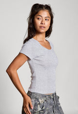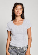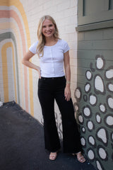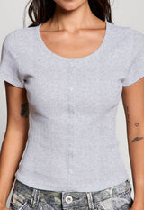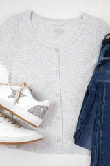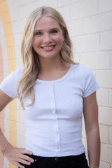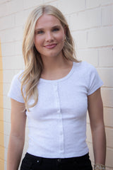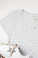 Add a touch of charm to your wardrobe with the Georgia Faux Button Pointelle Top in Light Heather Grey. Featuring delicate pointelle knit and a playful faux button front, this top pairs a cozy rib knit texture with a flattering round neck and breezy short sleeves. Perfect for layering or wearing solo, it’s your new go-to for effortless style with a fun twist!