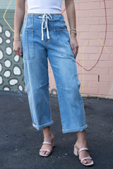 Get ready to rock the unconventional with Heidi Cuffed Cargo Barrel Jeans. These high-waisted, wide leg jeans feature a unique barrel style with cargo pockets, cuffed hems, and an elastic drawstring waist with a zipper closure!