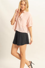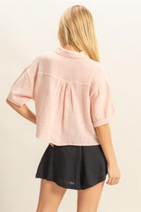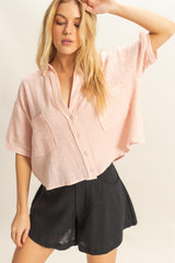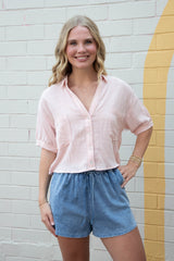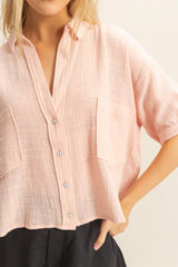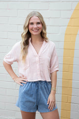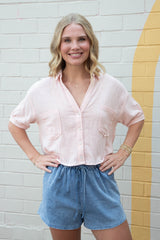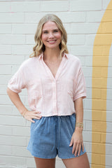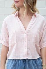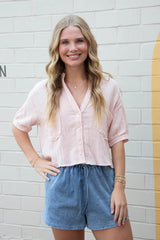 Unleash your summer style with our Janelle Cotton Gauze Crop Shirt in Light Pink! This playful cropped V-neck features convenient chest pockets and short sleeves for that perfect balance of cute and casual. The collared design adds just enough polish to take you from beach to brunch without missing a beat!