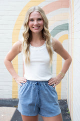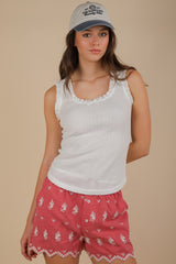 Elevate your summer style with our Jazmin tank! This playful white top features delicate pointelle details, a flirty ruffle trim, and an adorable bow at the scoop neckline. The round hem adds a touch of whimsy to this versatile piece that's perfect for sunny days and warm nights!