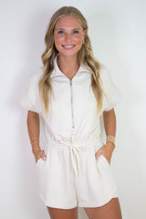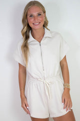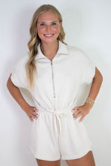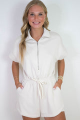 Slip into effortless style with our Kai Luxeknit Zip Up Romper in elegant Ecru! This playful one-piece features a convenient zip-up mock neck/collar for that extra touch of sophistication. The elastic drawstring waist lets you cinch to your perfect fit, while short dolman sleeves add a breezy vibe. Bonus: side pockets for all your little treasures! Perfect for lounging or looking cute on the go!