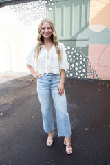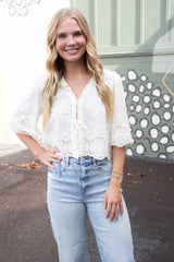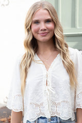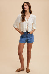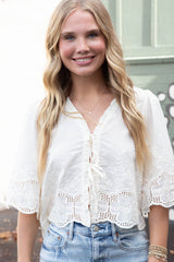Light up your wardrobe with the Katalina Floral Embroidered Blouse. Featuring beautiful floral embroidery, a tie front, and ruffled v-neck, this top is perfect for a playful and stylish look. The puffed half sleeves and scalloped edges add a touch of whimsy, while the semi-sheer fabric adds a hint of allure!