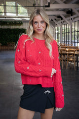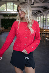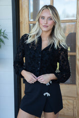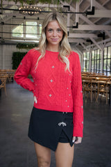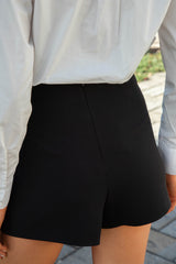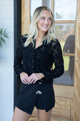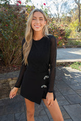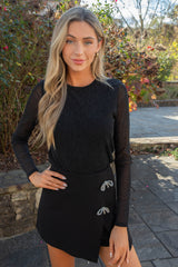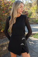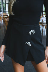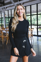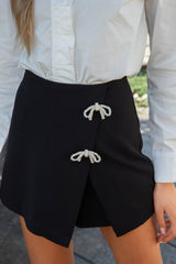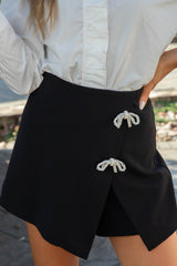 Add a touch of sparkle with the Londyn Rhinestone Bow Wrap Skort in black. Features elegant rhinestone bows and a wrap skort design for a flattering fit. Elastic waist for comfort and ease. Perfect for any occasion!