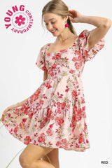 Luisa Floral Puff Sleeve Mini Dress, Red