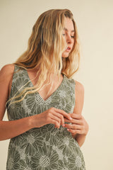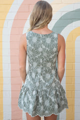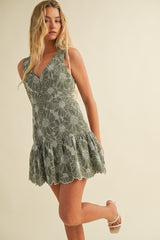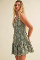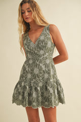 Step into sunshine with the Madelyn Floral Embroidered V-Neck Dress in olive. This playful mini dress features delicate floral embroidery, a flirty ruffled hem, and convenient side pockets for your essentials. The sleeveless design and back zipper closure make it easy to wear, while the flattering V-neck adds a touch of charm. Perfect for twirling through warm days and breezy evenings!