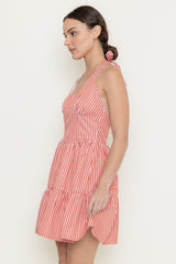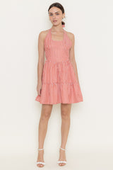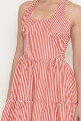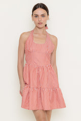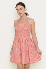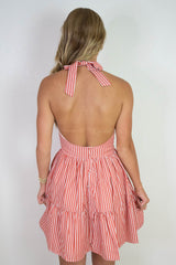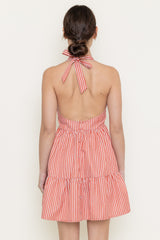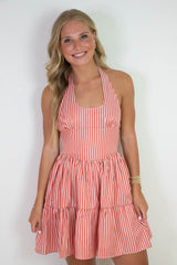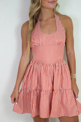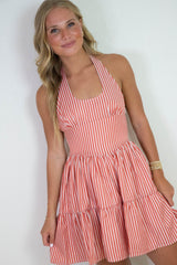 This playful Marlie Halter Tie Neck Dress features bold white and red stripes that bring a fresh, fun vibe. Its tiered mini length adds flirty movement, while the back faux button details and side zipper closure offer easy wear with a stylish twist. Perfect for sunny days and lively nights!