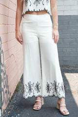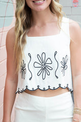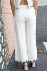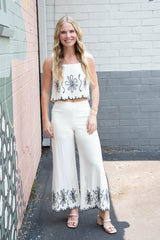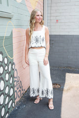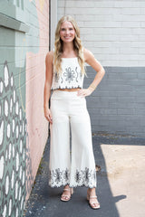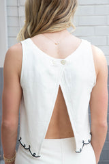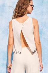 Get ready to add some playful and quirky style to your wardrobe with the Mavis Embroidered Linen Blend Set! This natural-colored set features delicate embroidery, a scalloped hem, and a flirty open back with button detail. The tank has a square neckline for a unique touch, and the pants feature a side zipper closure. Upgrade your summer look with this fun and stylish set!