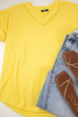 Introducing your new go-to top: the Melody V-Neck Ribbed Top in light yellow! With a flattering V-neckline and short sleeves, this top is perfect for any occasion. Say goodbye to boring basics, and hello to effortless style!