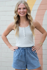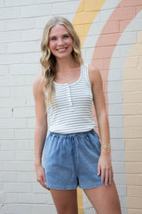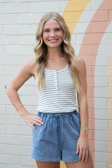 Spice up your wardrobe with the Mikayla Striped Tank! Featuring a playful scoop neck, unique button closure, and raw edge details, this tank is the perfect addition to any casual outfit. Its round hem adds a touch of charm, making it a must-have for any fashion-forward individual!