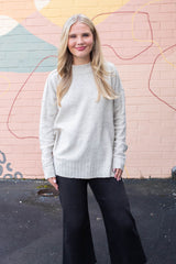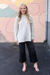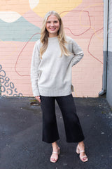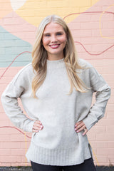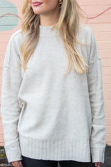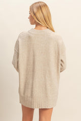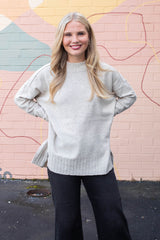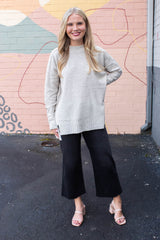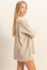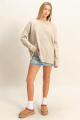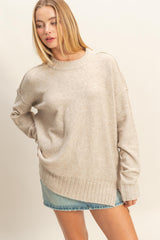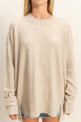 Slip into cozy charm with the Oakleigh Relaxed Fit Sweater in Light Taupe. Its oversized, long silhouette paired with a crew neckline and long sleeves makes lounging effortlessly stylish. Playful raw seam details and front side slits add just the right amount of edge, while the wide ribbed knit trim keeps things comfy and lightweight for all-day wear. Perfect for relaxing or layering up with flair!