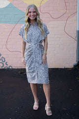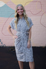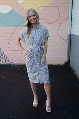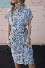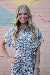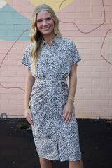 Unleash your wild side in the Alaia Animal Print Midi Dress. This taupe dress features a playful animal print and a button-down style with drop shoulders and short sleeves. The waist tie and midi length add a hint of sophistication, while the collared neckline adds a touch of quirkiness. Go wild, but stay classy!