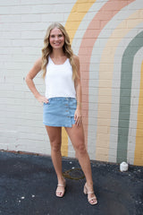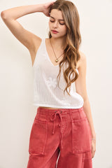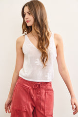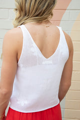 Introducing the Alexa Floral Knit Sleeveless Top! With a delicate floral knit design, this top offers a semi-sheer look that's perfect for any occasion. The sleeveless style, combined with a v-neck and back, adds a touch of playfulness to your outfit. Plus, the slightly cropped length adds a trendy and unique touch. Bring some fun and flair to your wardrobe with this top!