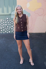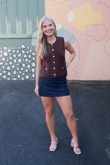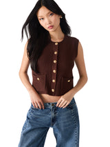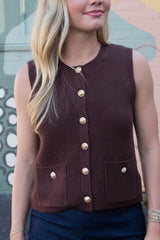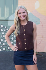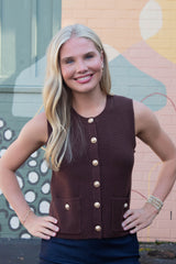 Add a touch of charm to your outfit with the Aliya Gold Button Sweater Vest in rich chocolate. Featuring shiny gold buttons, a classic button-down front, and handy front pockets, this sleeveless vest with a round neck is perfect for layering with a playful twist. Cozy yet stylish, it’s your new go-to for effortless cool!