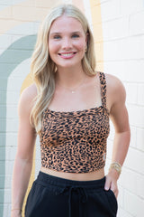 Add a wild twist to your wardrobe with this playful leopard print cami. Crafted from ribbed knit fabric, it features a trendy square neckline and a flattering cropped fit with a round hem. Perfect for layering or wearing solo, this top brings a fun, fierce vibe to any outfit!