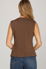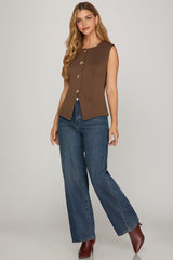 The Allyson Vest Top in Brown offers a chic sleeveless design with elegant gold button details for a polished look. Its semi-fitted silhouette enhances your shape while the silky knit fabric with moderate stretch ensures comfortable wear throughout the day. Perfect for layering or wearing on its own, this vest blends style and ease effortlessly.