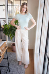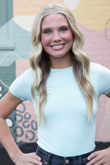 Introducing the Amaris Double Layered Bodysuit in mint. Featuring cap sleeves, a snap button closure, and a round neck, this bodysuit is perfect for any occasion. Stay comfortable and stylish all day long!