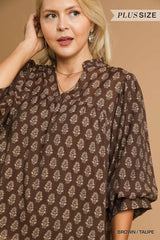 Bring a touch of whimsy to your wardrobe with the Amaya Floral Block Print Blouse in warm brown and taupe. Featuring a charming split V-neck and a playful ruffled collar, this blouse adds a flirty flair to your look. The half sleeves keep it breezy and perfect for any season. Embrace effortless style with a fun, floral twist!