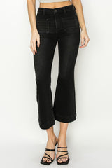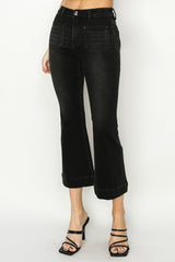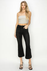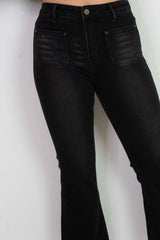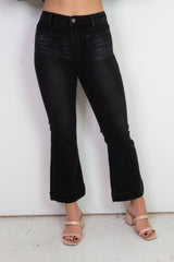 Step into style with the Amelia Patch Pocket Ankle Flare Jeans in Black. Featuring playful patch pockets and a flattering high-rise fit, these cropped jeans add a fun twist to your everyday look. The ankle flare brings just the right amount of flair, perfect for showing off your favorite shoes with a confident stride!