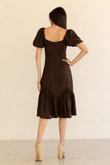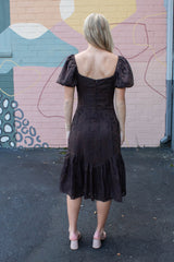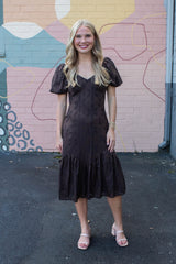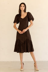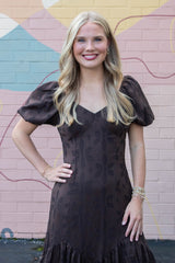 The Ana Mesh Flower Midi Dress in warm brown features a charming sweetheart neckline and flirty short puff sleeves for a playful vibe. Its midi length and ruffled hem add a fun, twirly touch, while the back zipper closure ensures a perfect fit. Ideal for sunny days and special occasions alike, this dress blends romantic details with effortless style!