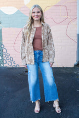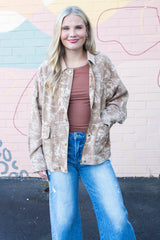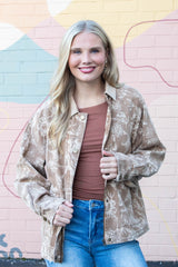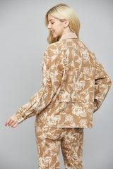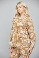 Embrace playful charm with the Angelica Corduroy Collared Floral Jacket in light brown. Featuring a cozy contrast corduroy collar and snap button closure, it adds a touch of whimsy to your look. Front pockets keep essentials handy while the vibrant floral print brings joyful style to every outfit. Perfect for those who love comfort with a fun twist!