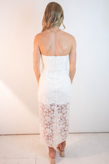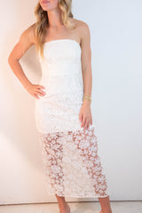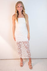 Embrace the playful charm of our April Strapless Lace Midi Dress. The strapless design and floral lace details exude effortless femininity, while the sheer bottom and back slit add a touch of flirtiness. Complete with a back zipper closure for convenience. Perfect for any occasion!
