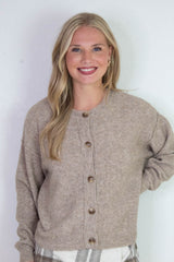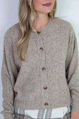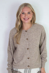 The Aria Rib Trim Round Neck Cardigan in Khaki adds a cozy twist to your everyday look. With its playful ribbed trim and classic button-down front, this long-sleeved cardigan keeps you comfy and stylish all day long. Perfect for layering or wearing solo, it’s a charming go-to for effortless cool!