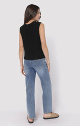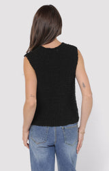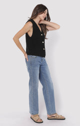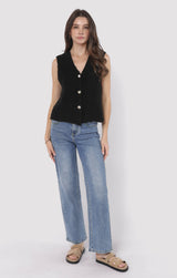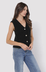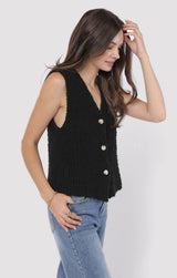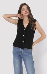 Add a dash of fun to your wardrobe with the Arlo Cardi Vest in sleek black. This playful piece features a button-down front, a flattering V-neck, and a sleeveless design that’s perfect for layering or wearing solo. Whether you’re dressing up or keeping it casual, this vest brings effortless style and a touch of charm to any outfit!