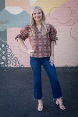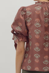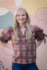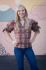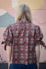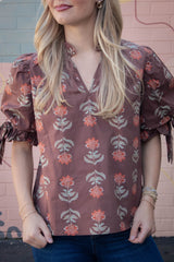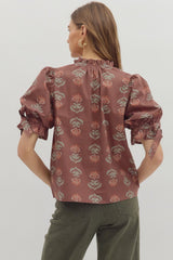 Unleash your inner goddess with the Athena Floral Print Ruffle Neck Top. The block floral print adds a touch of whimsy, while the ruffled V-neck and bow-detailed puff sleeves create a playful yet elegant look. Perfect for any occasion, this brown top will make you feel confident and stylish!