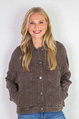 This Audrey Button Down Denim Jacket in Black Coffee (dark brown) brings together classic charm and cool flair. With its long sleeves, crisp collar, and handy chest and side pockets, it's as practical as it is stylish. The lightly distressed, washed denim and pleated back add a playful twist, making this jacket your go-to for effortless, laid-back vibes all year round!