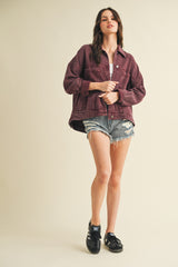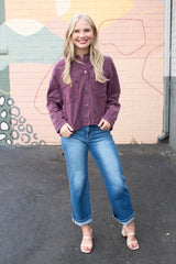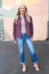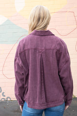 This Audrey Button Down Denim Jacket in Cherry Lacquer brings together classic charm and cool flair. With its long sleeves, crisp collar, and handy chest and side pockets, it's as practical as it is stylish. The lightly distressed, washed denim and pleated back add a playful twist, making this jacket your go-to for effortless, laid-back vibes all year round!