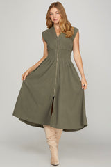 Embrace cozy charm with the Audrey Drop Shoulder Corduroy Dress in olive green. Featuring a playful V-neck and easy zipper front, this midi-length dress combines comfort and style effortlessly. The smocked elastic waist adds a flattering touch, while side pockets keep your essentials close. Perfect for layering or wearing solo, it’s your new go-to for laid-back days with a dash of flair!
