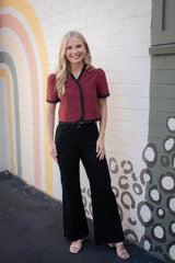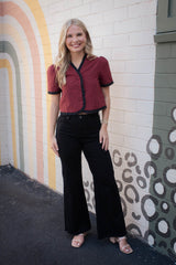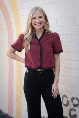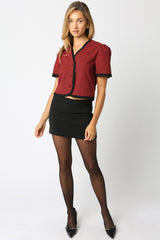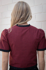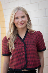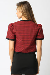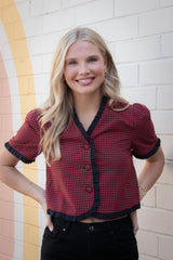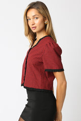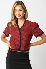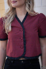 Bring some playful charm to your wardrobe with the Augustine Contrast Trim Checkered Top. Featuring a bold red and black checkered pattern, this cropped blouse delights with ruffled contrast trim and a flirty V-neckline. Short sleeves and a button-down front add casual ease, making it perfect for sunny days or layering up for fun nights out!